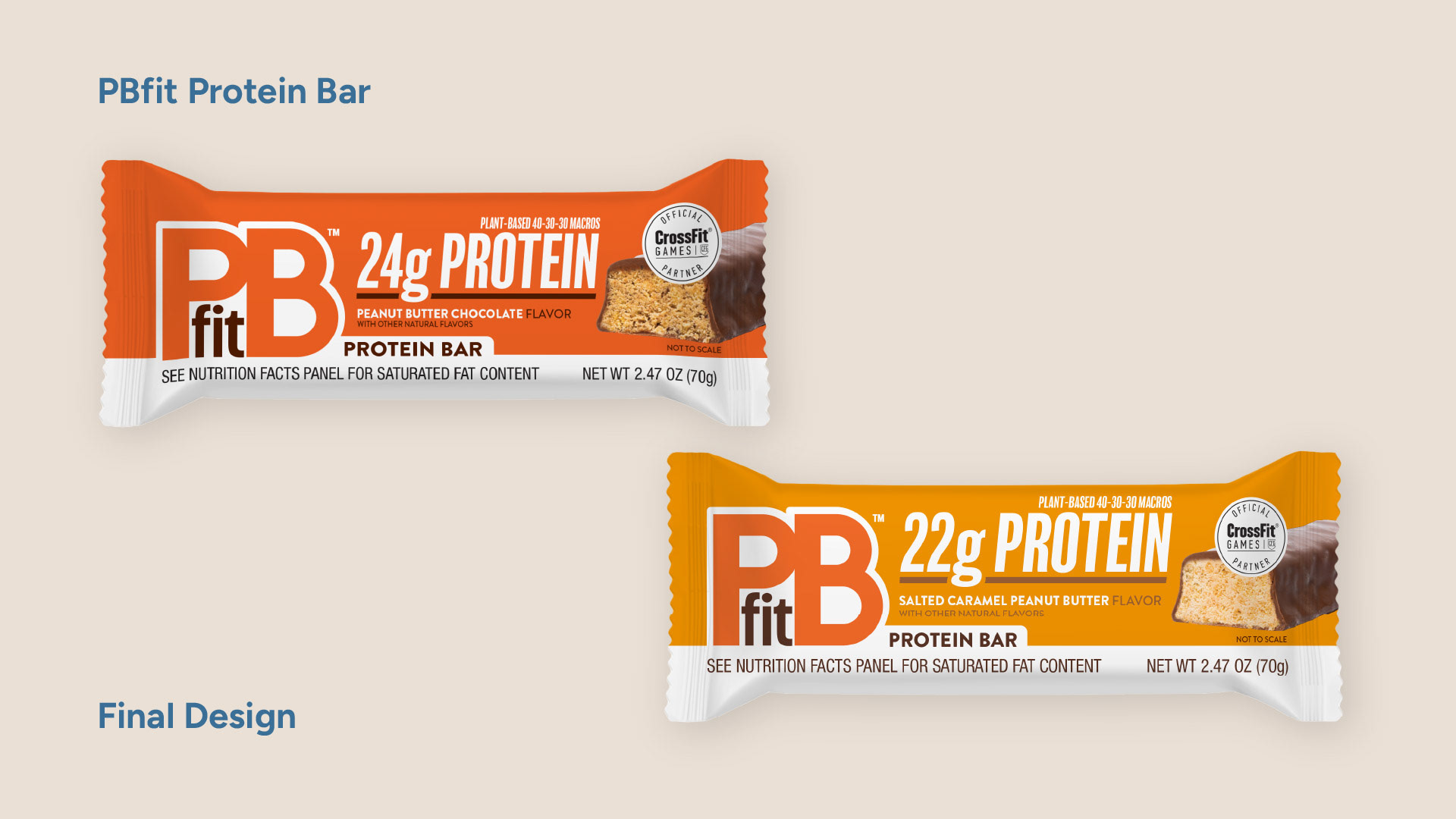 The finished label and display box designs are the result of over 18 months of ideating, designing, iterating, getting feedback, and iterating some more. It was a very conscious choice to design a label that is bold and athletic. From the outset, I wanted to design a label that clearly communicated to customers why they should choose PBfit over other protein bar options. Additionally, in a saturated market, leaning on our classic PBfit orange helps us stand out on the shelf. Teaming up with CrossFit to be their official protein bar was another key differentiator.
